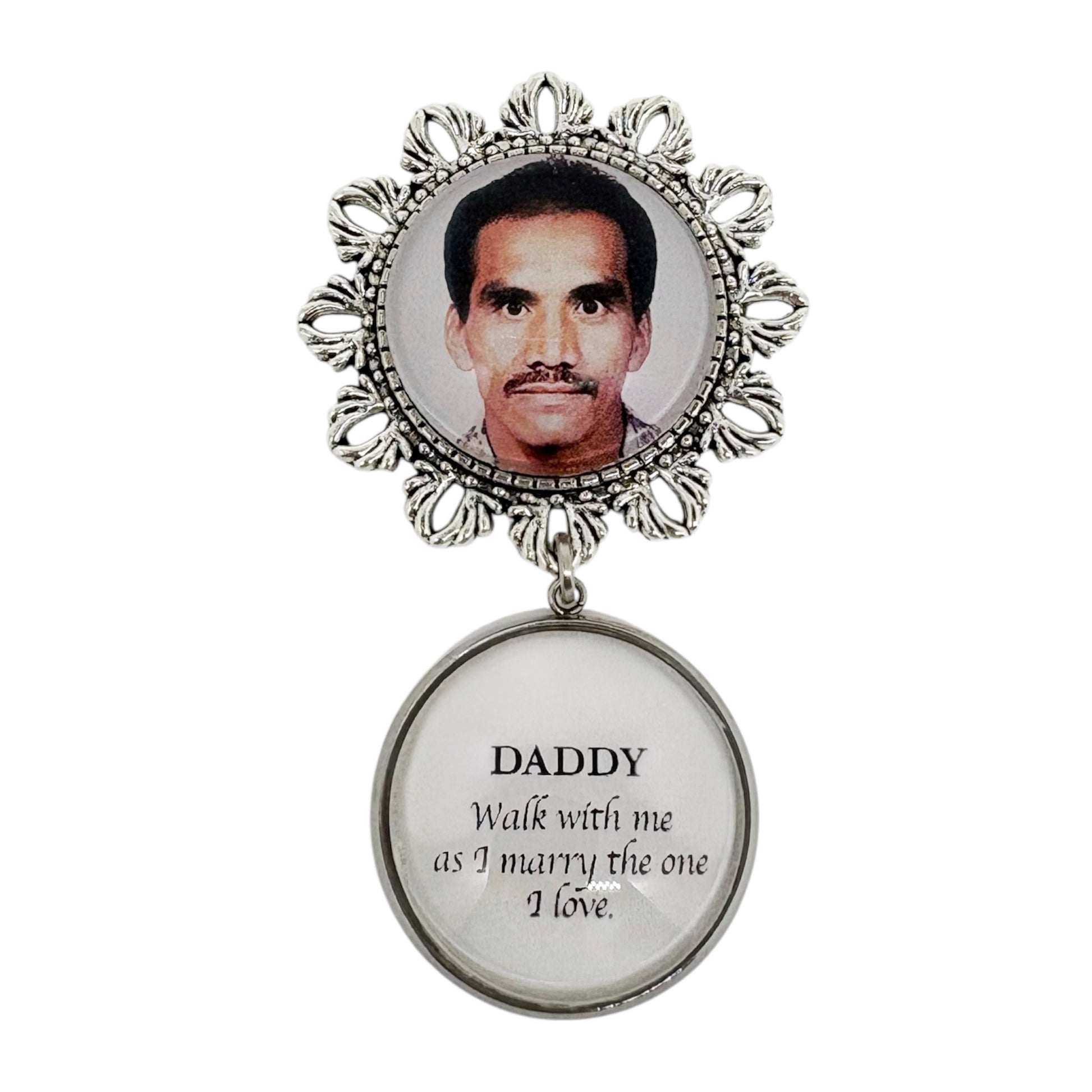 Keep their memory close with this elegant Medium-sized photo pin charm with your choice of quote. Designed to be attached securely to a boutonniere or wedding bouquet, it’s a beautiful way to honor someone dear during your celebration.
