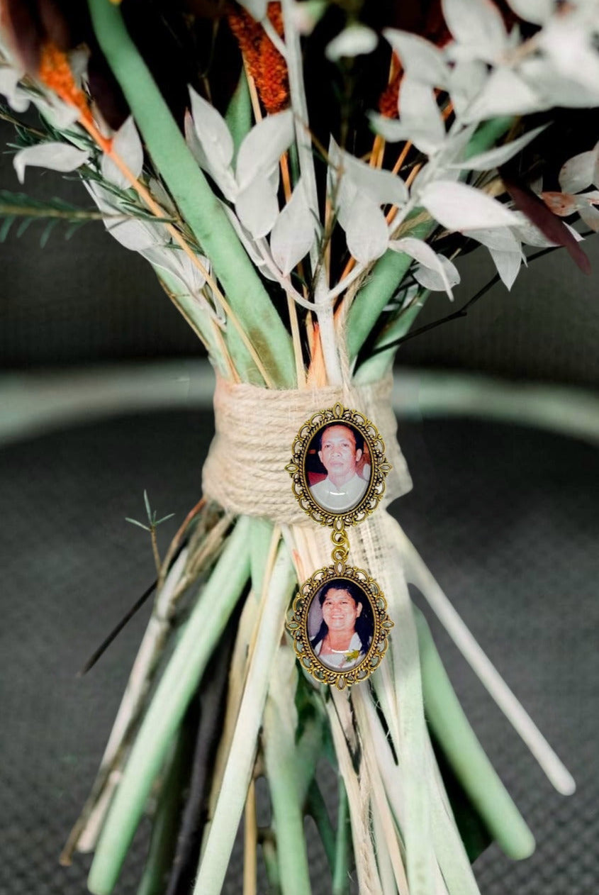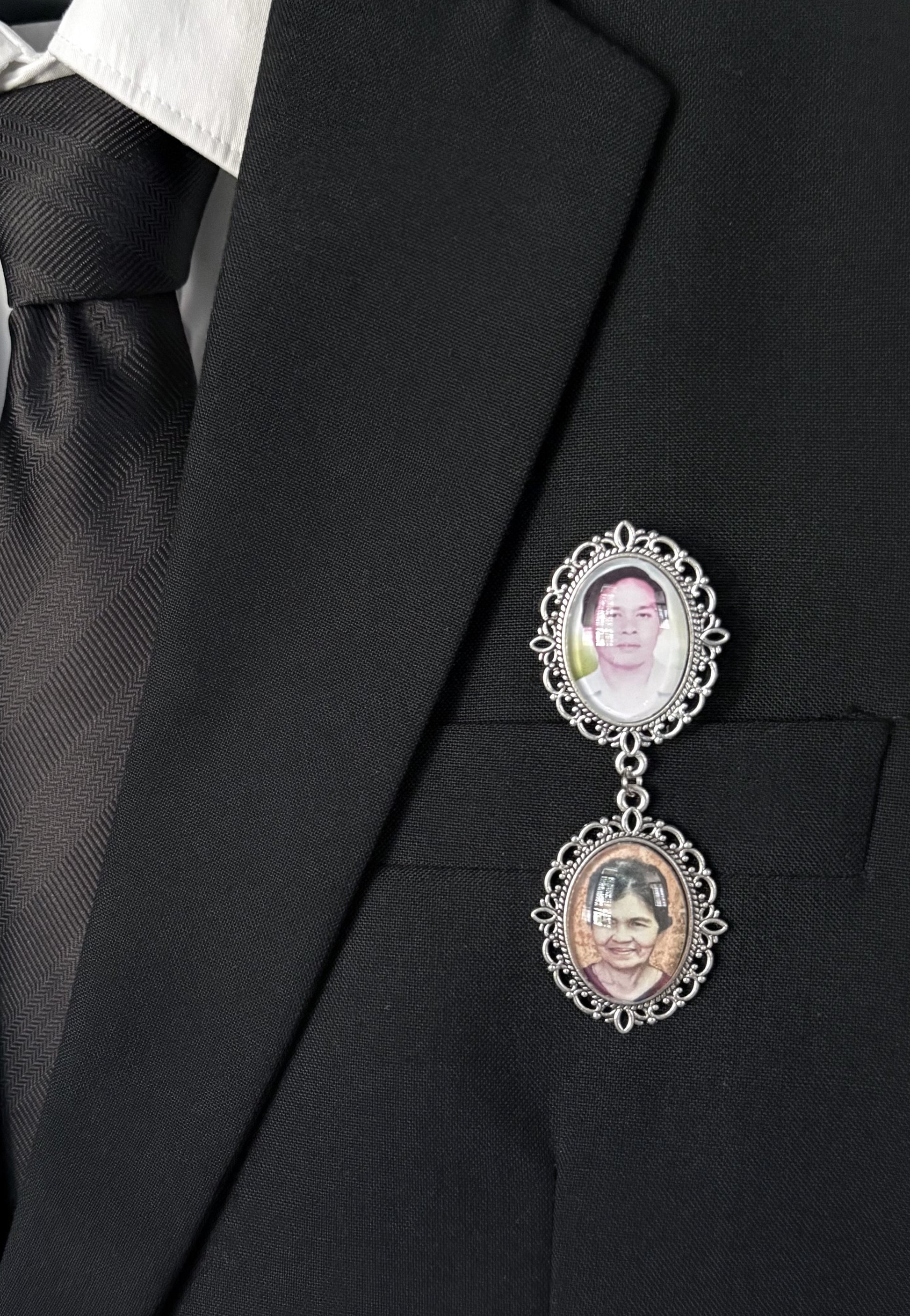 Keep their memory close with this elegant double photo pin charm. Designed to be attached securely to a boutonniere or wedding bouquet, it’s a beautiful way to honor someone dear during your celebration.