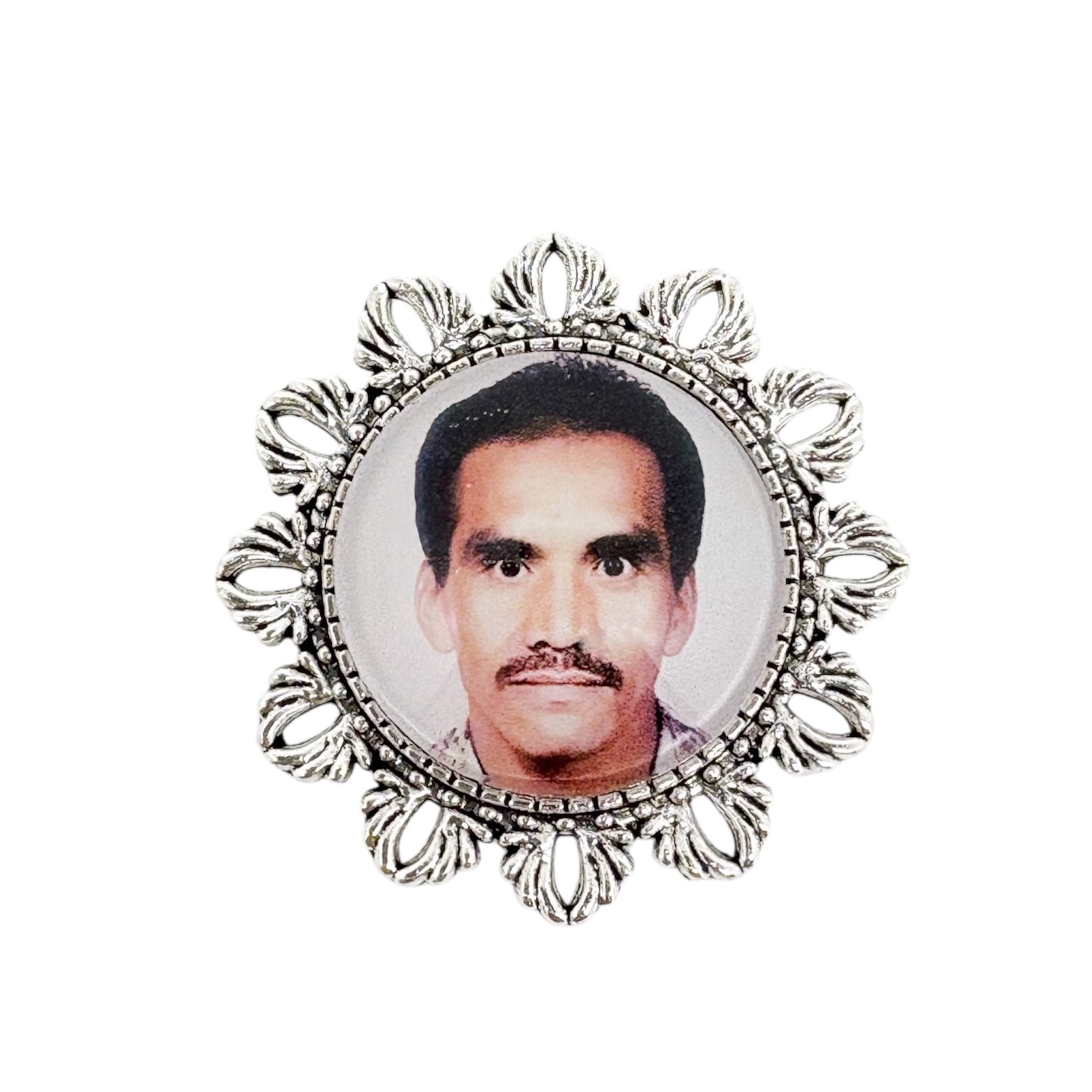 Keep their memory close with this elegant medium-sized photo pin charm. Designed to be attached securely to a boutonniere or wedding bouquet, it’s a beautiful way to honor someone dear during your celebration.