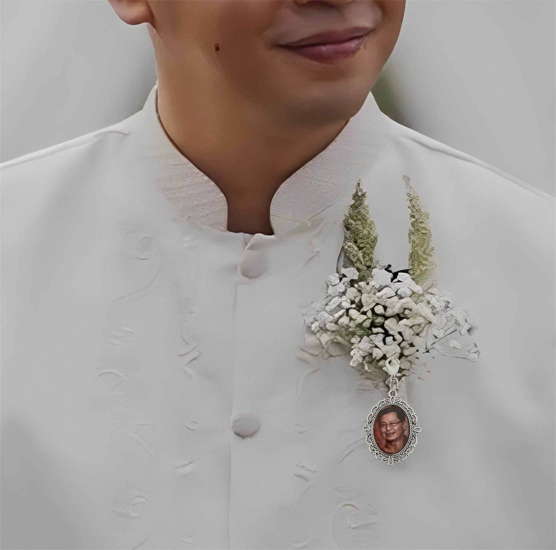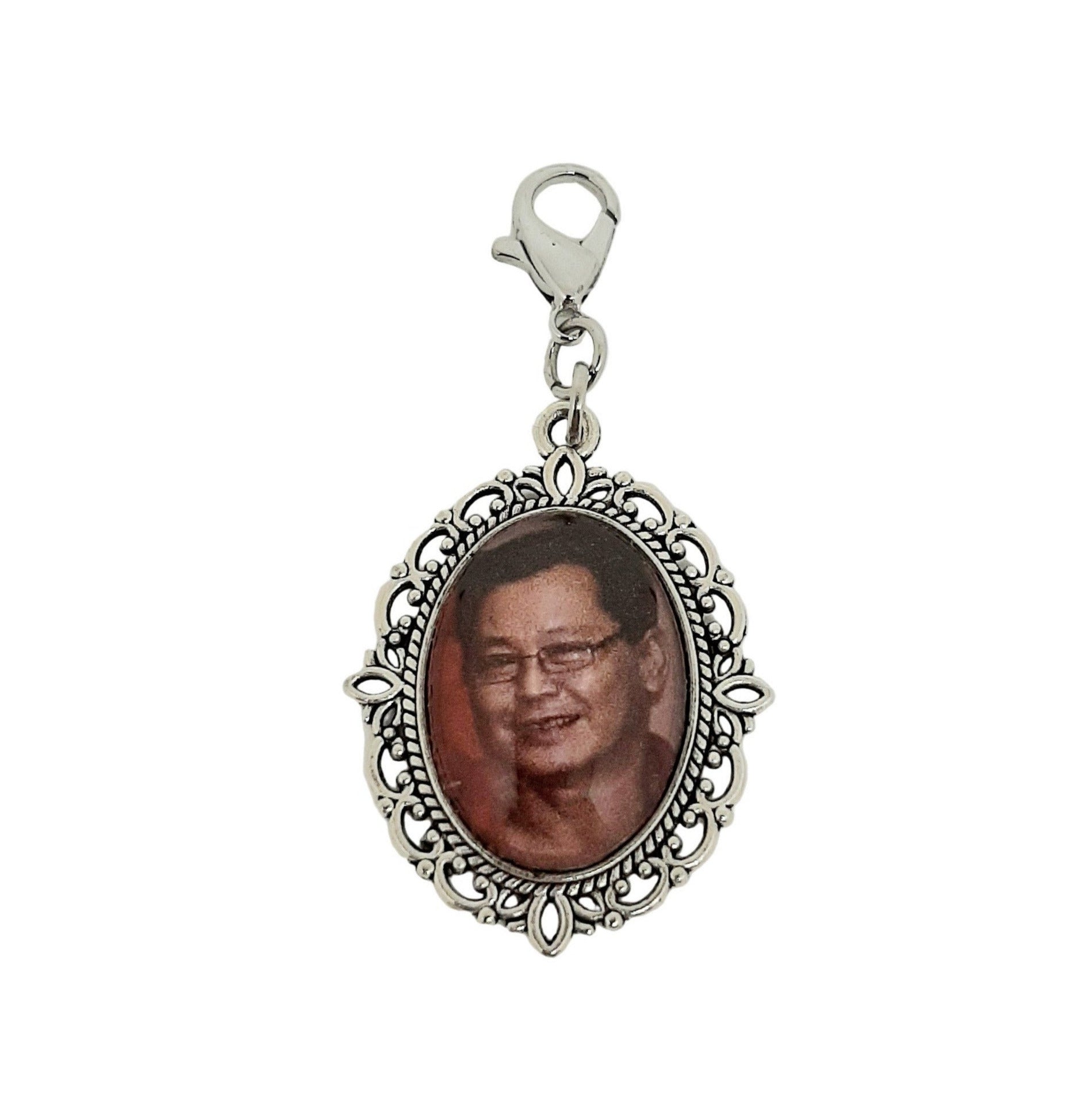 Carry the memory of someone dear close to your heart with this elegant medium-sized pendant charm. Perfect for attaching to a boutonniere or a wedding bouquet, it’s a meaningful way to keep them part of your celebration.