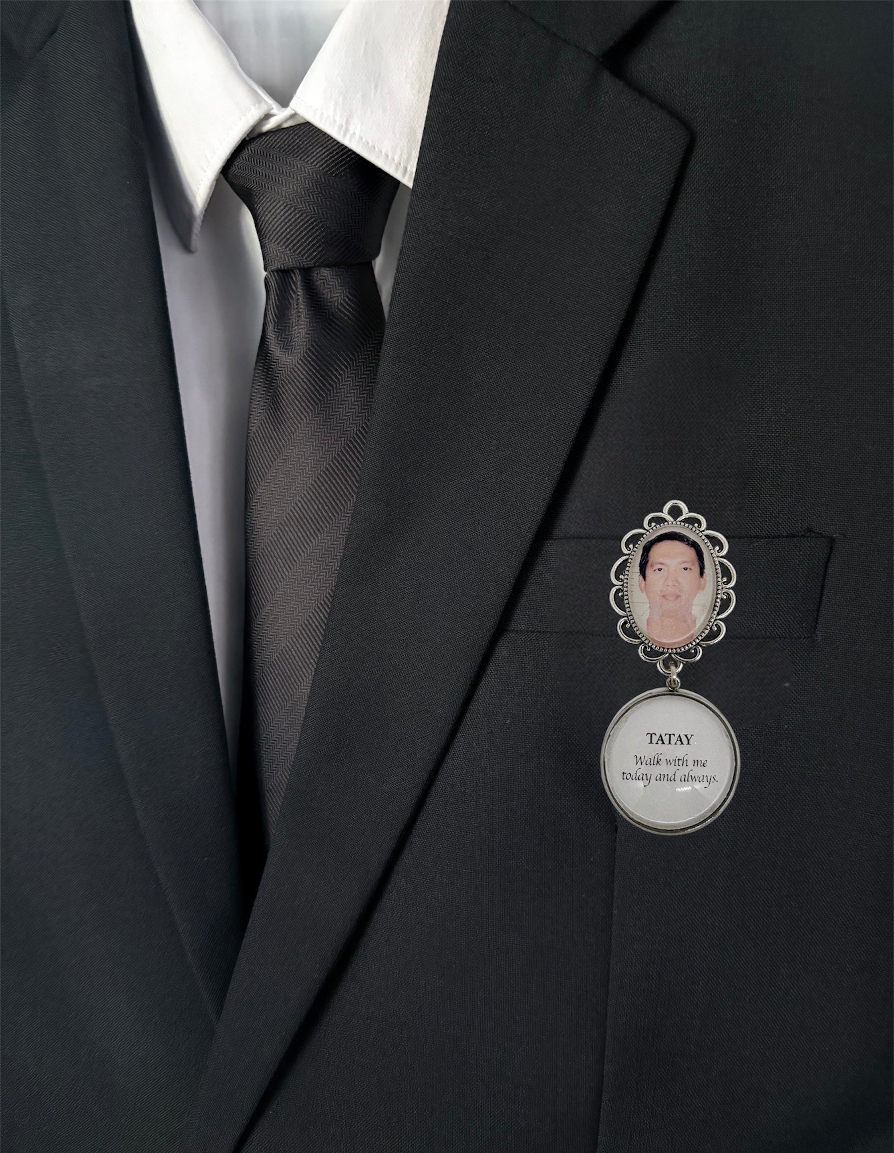Keep their memory close with this elegant Medium-sized photo pin charm with your choice of quote. Designed to be attached securely to a boutonniere or wedding bouquet, it’s a beautiful way to honor someone dear during your celebration.