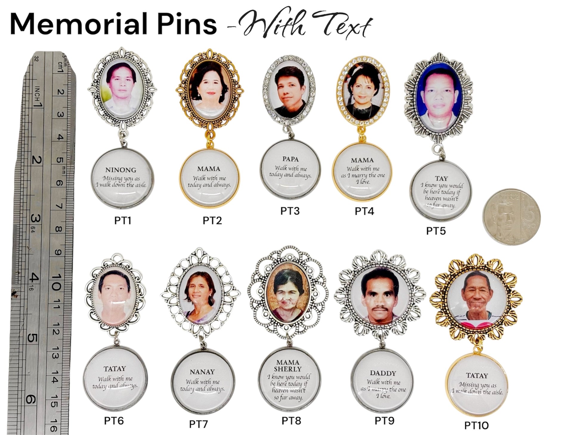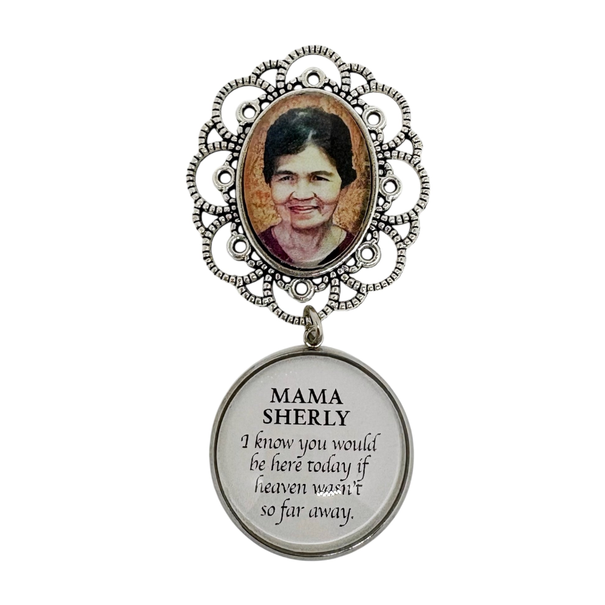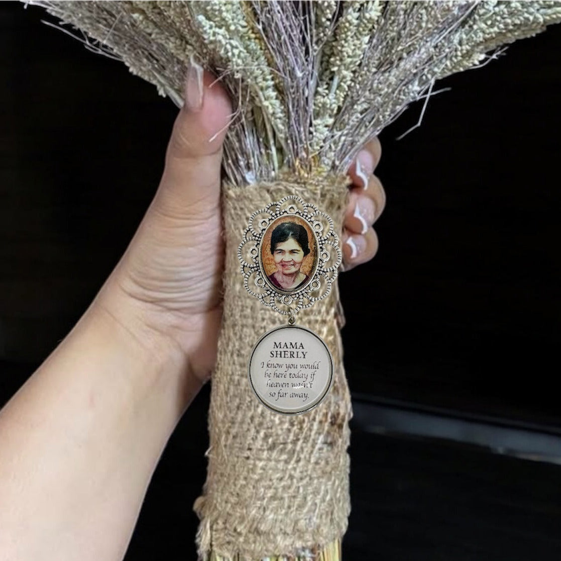 Keep their memory close with this elegant Medium-sized photo pin charm with your choice of quote. Designed to be attached securely to a boutonniere or wedding bouquet, it’s a beautiful way to honor someone dear during your celebration.